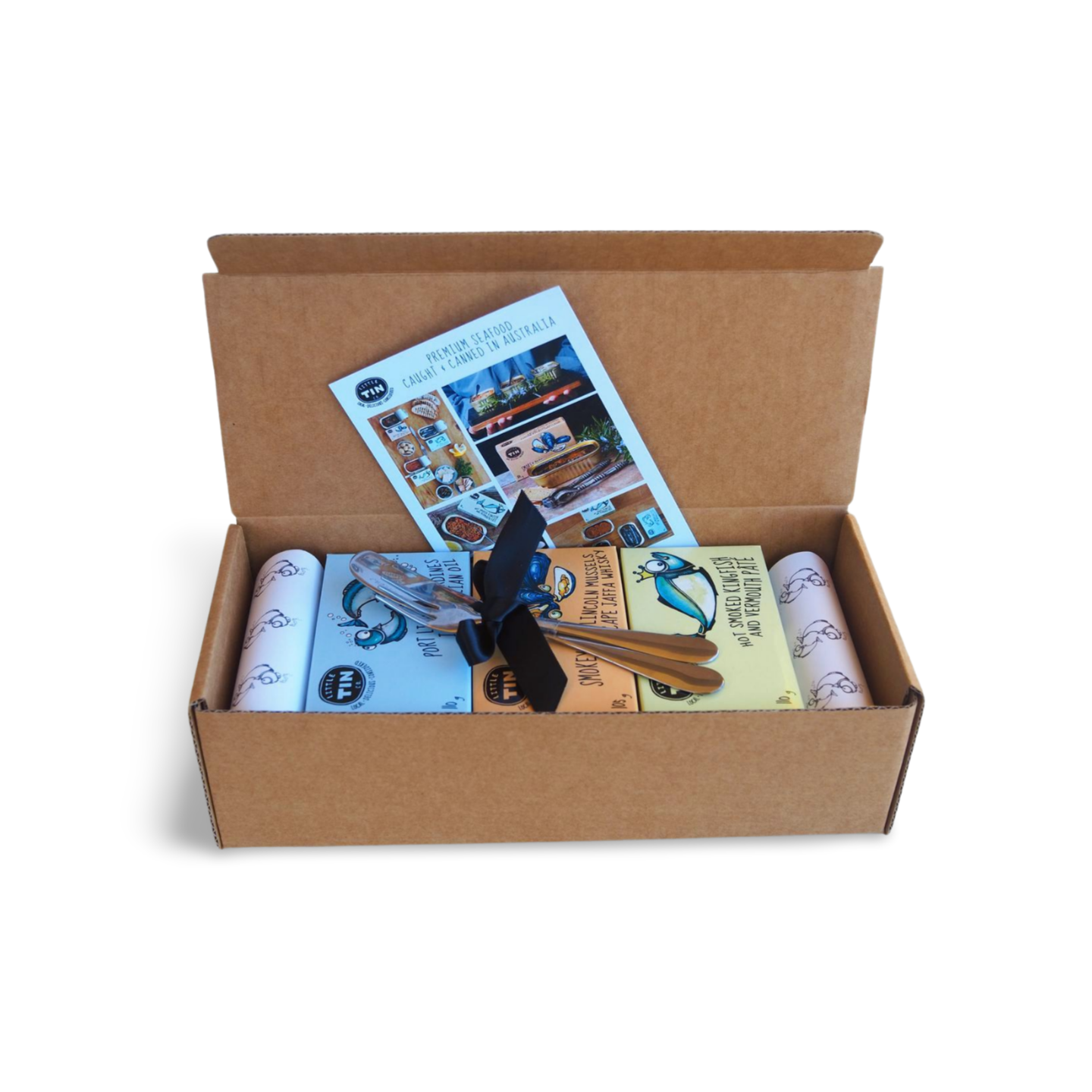 The perfect gift for the tinned fish lover in your life. A selection of Little Tin Co's original tinned fish with a pâté knife and oyster fork set so they can tuck in straight away.
